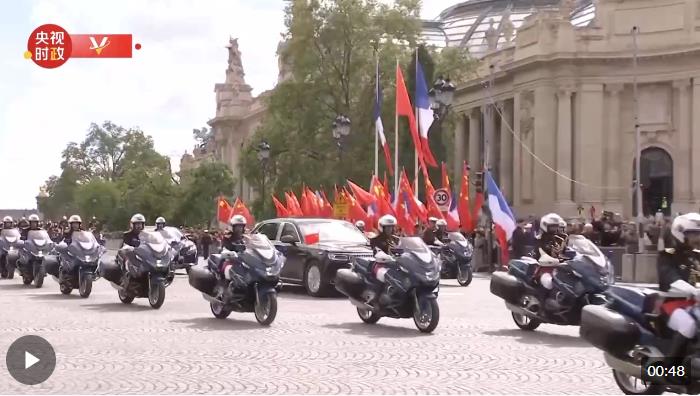 當(dāng)?shù)貢r(shí)間5月6日下午,歡迎儀式后,習(xí)近平主席和夫人彭麗媛在共和國(guó)衛(wèi)隊(duì)148名騎兵組成的禮兵馬隊(duì)和摩托車(chē)隊(duì)護(hù)衛(wèi)下,乘車(chē)前往愛(ài)麗舍宮。