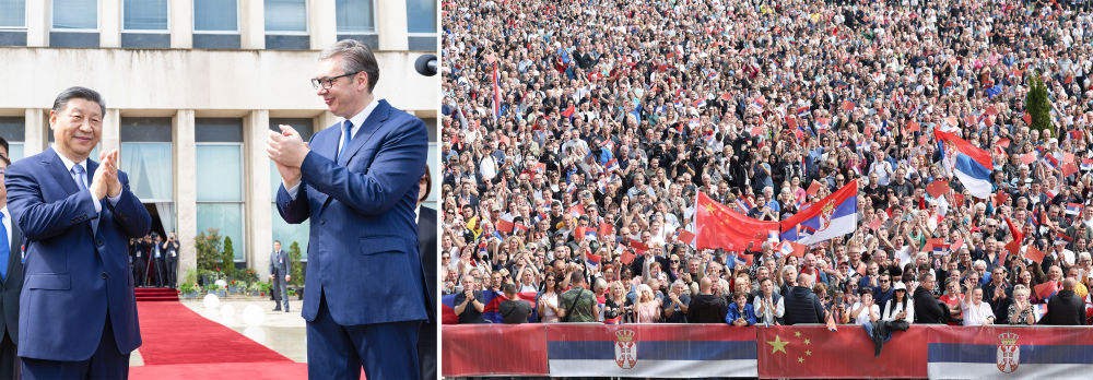 在塞爾維亞,武契奇總統(tǒng)率眾多政要赴機(jī)場迎接習(xí)近平主席。近2萬名塞爾維亞民眾齊聚塞爾維亞大廈廣場,揮舞中塞兩國國旗,熱情高呼“中國”的場景,令人感動;