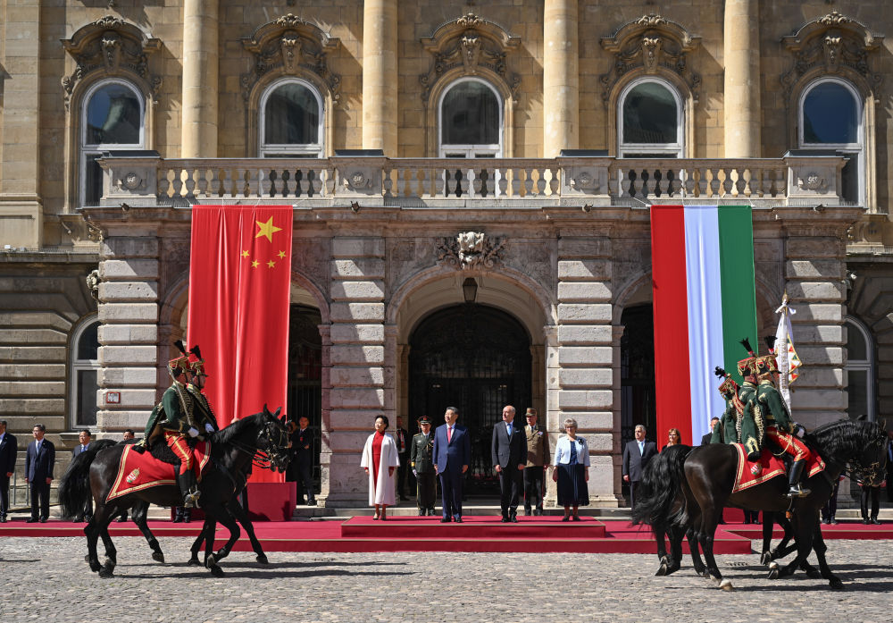 當(dāng)?shù)貢r間5月9日,習(xí)近平主席在布達(dá)佩斯出席匈牙利總統(tǒng)舒尤克和總理歐爾班共同舉行的隆重歡迎儀式。新華社記者 謝環(huán)馳 攝