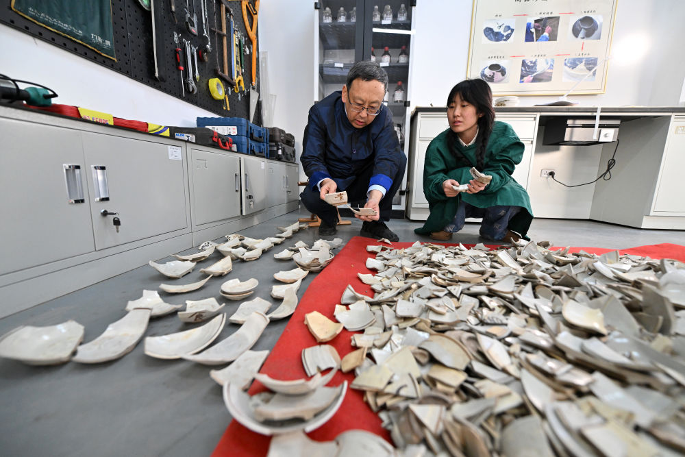 2024年2月25日,在山西云岡研究院可移動(dòng)文物修復(fù)室,云岡研究院院長杭侃(左)和同事交流瓷器修復(fù)方案。