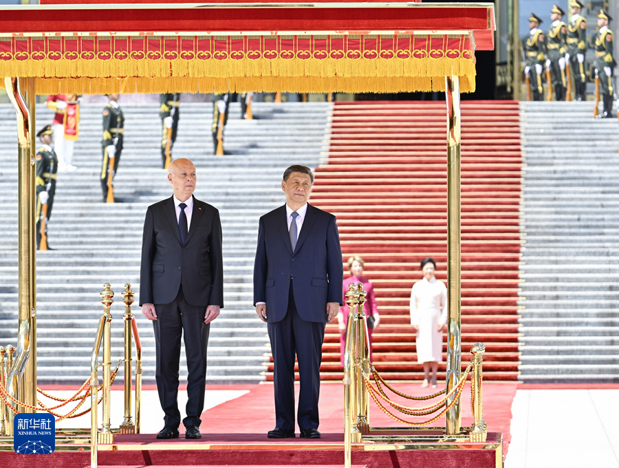 5月31日上午,國家主席習(xí)近平在北京人民大會(huì)堂同來華國事訪問并出席中國-阿拉伯國家合作論壇第十屆部長級(jí)會(huì)議開幕式的突尼斯總統(tǒng)賽義德舉行會(huì)談。這是會(huì)談前,習(xí)近平在人民大會(huì)堂東門外廣場為賽義德舉行歡迎儀式。新華社記者 翟健嵐 攝