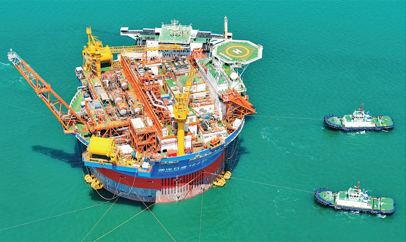 “??惶枴保莵喼奘姿覉A筒型浮式生產儲卸油裝置。該裝置集原油生產、存儲、外輸等功能于一體,被網友們昵稱為“超級能源碗”,也是完全由我國自主設計建造的海上油氣加工廠。圖為2024年5月12日,“??惶枴睆闹袊S颓鄭u國際化高端裝備制造基地離港啟運。 人民圖片 張進剛/攝