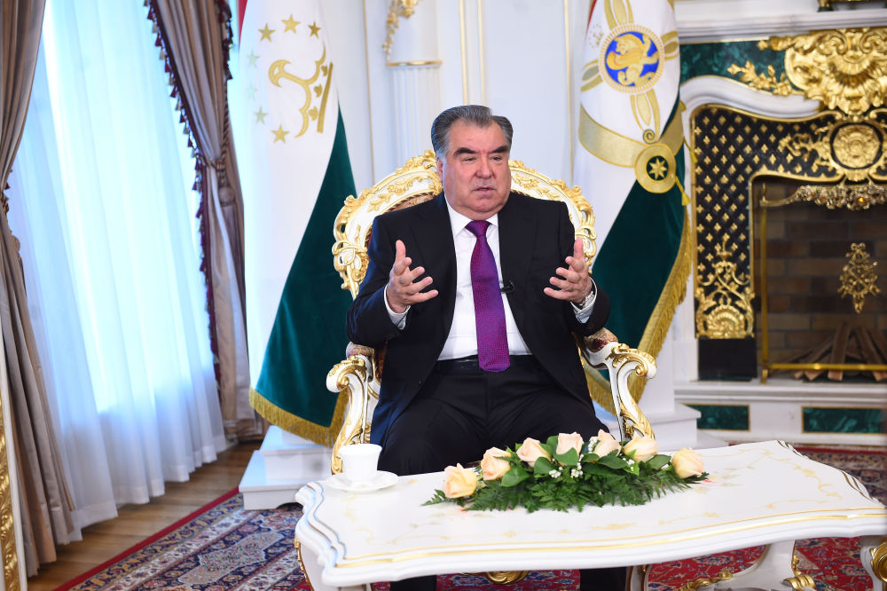 2019年4月13日,塔吉克斯坦總統(tǒng)拉赫蒙在杜尚別接受中國(guó)媒體聯(lián)合采訪。