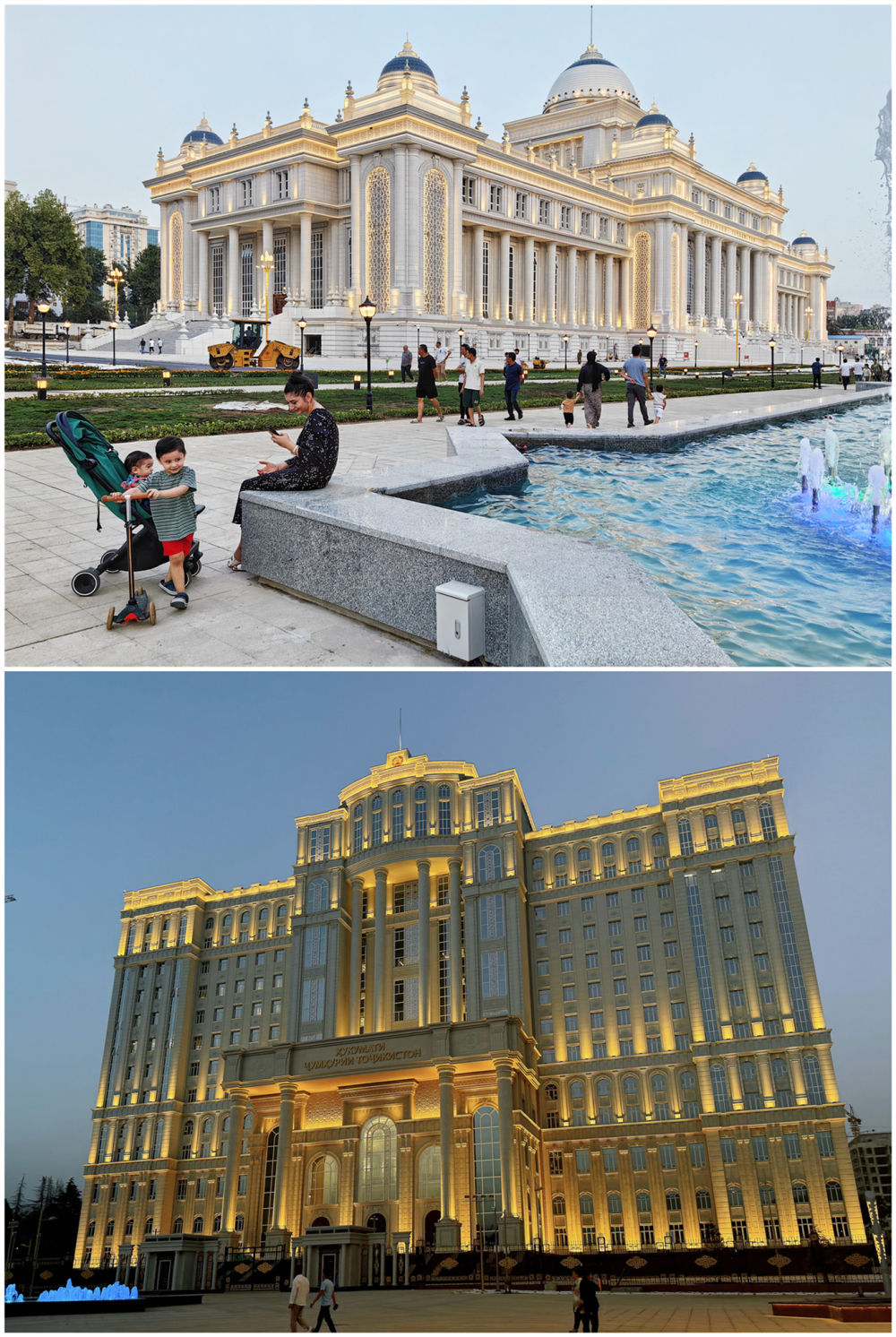 塔議會大樓、政府大樓坐落于杜尚別著名的魯達(dá)基大道,相隔數(shù)百米。議會大樓同總統(tǒng)府相望,政府大樓則俯瞰杜尚別另一條交通干道——索莫尼大道。兩座大樓融合歐亞古典柱廊結(jié)構(gòu)、塔吉克民族特色雕刻、伊斯蘭文化風(fēng)格的設(shè)計(jì),外觀大氣、典雅莊重,同魯達(dá)基大道兩側(cè)的古樹、鮮花、噴泉相映成景。