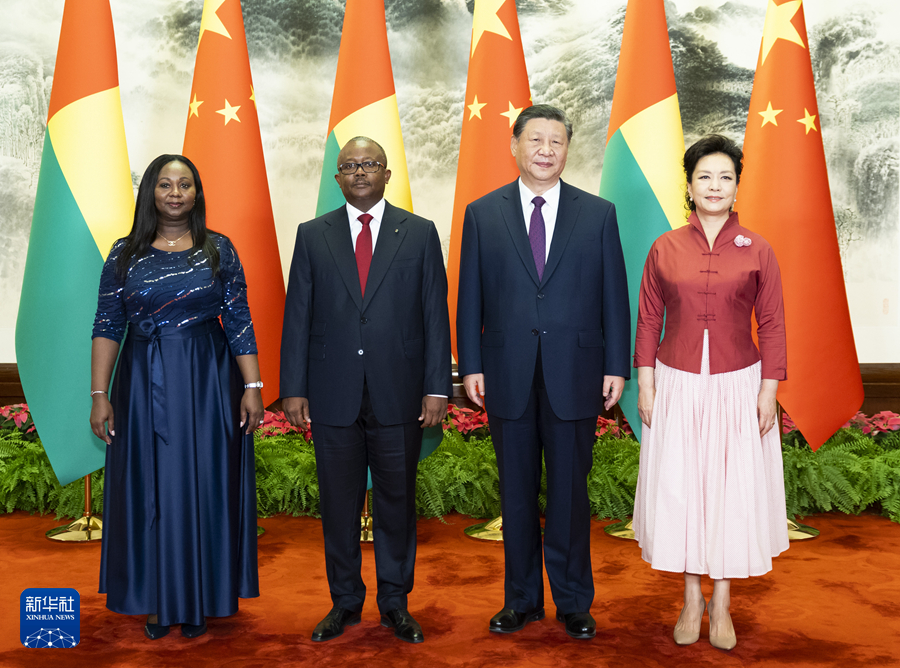 7月10日下午,國家主席習(xí)近平在北京人民大會(huì)堂同來華進(jìn)行國事訪問的幾內(nèi)亞比紹總統(tǒng)恩巴洛舉行會(huì)談。這是會(huì)談前,習(xí)近平和夫人彭麗媛同恩巴洛和夫人迪尼西婭合影。新華社記者 黃敬文 攝
