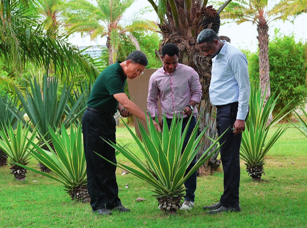 在三亞崖州灣科技城,非洲留學(xué)生跟隨中國(guó)熱帶農(nóng)業(yè)科學(xué)院研究員易克賢(左一)在觀察劍麻育種材料長(zhǎng)勢(shì)(2024年5月17日攝)。黎多江攝/本刊