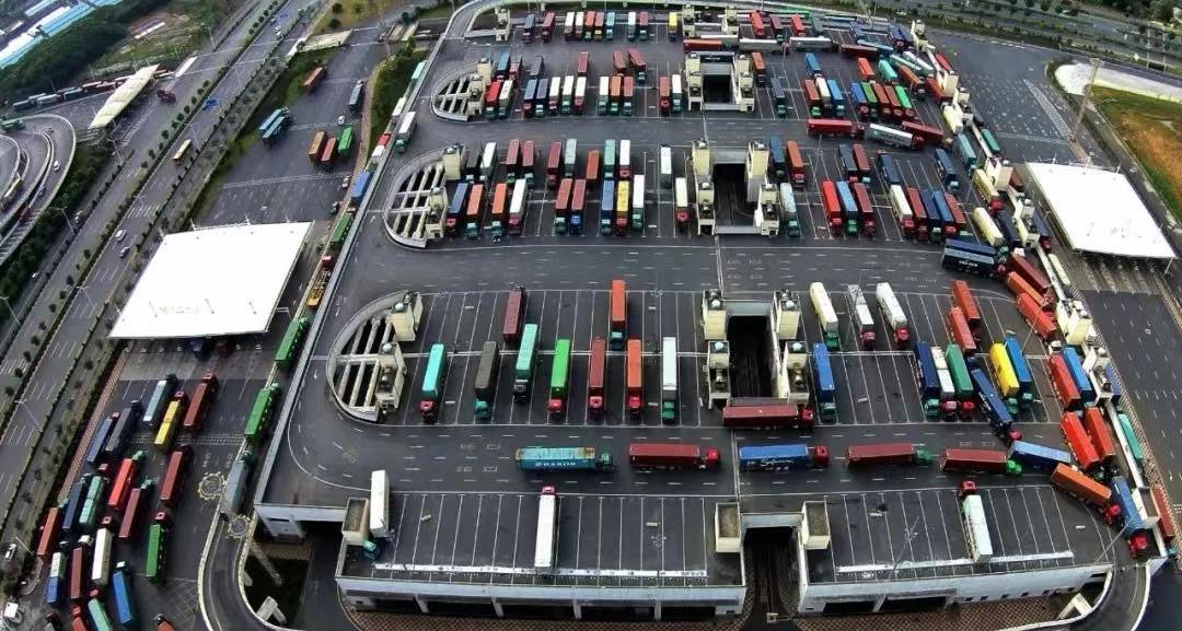 浙江義烏港等待通關(guān)的集裝箱貨車