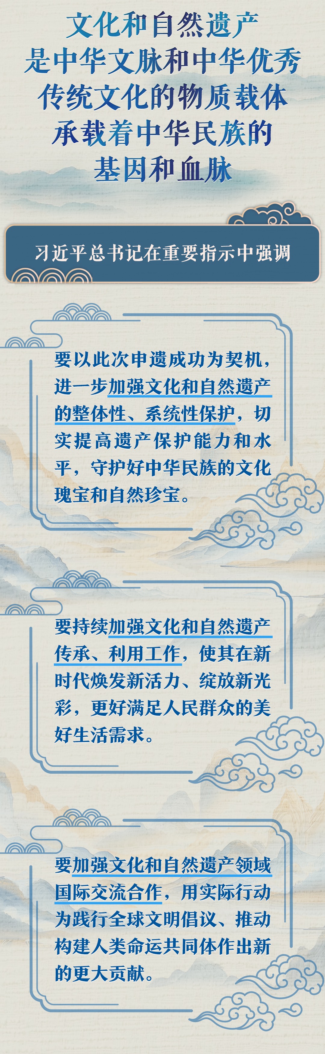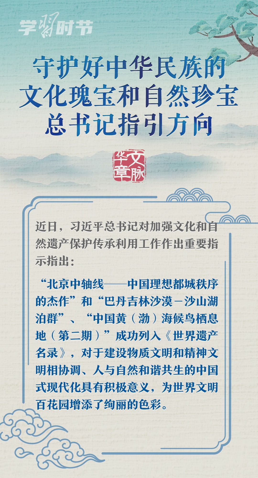 文化遺產(chǎn)體現(xiàn)了中華民族旺盛的生命力和創(chuàng)造力,自然遺產(chǎn)昭示了神奇的自然造化同中華民族的和諧依存關(guān)系。習(xí)近平總書(shū)記一直以來(lái)高度重視文化和自然遺產(chǎn)保護(hù)傳承利用工作,近日專門就此作出重要指示強(qiáng)調(diào),守護(hù)好中華民族的文化瑰寶和自然珍寶,讓文化和自然遺產(chǎn)在新時(shí)代煥發(fā)新活力綻放新光彩。讓我們一同學(xué)習(xí)。