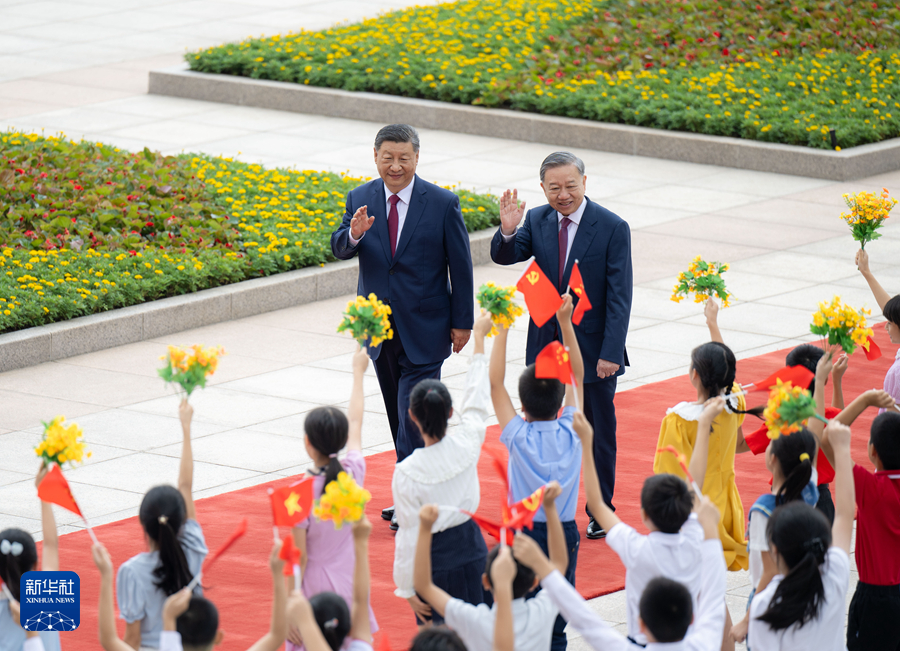 8月19日,中共中央總書記、國家主席習(xí)近平在北京人民大會堂同來華進行國事訪問的越共中央總書記、國家主席蘇林舉行會談。這是會談前,習(xí)近平在人民大會堂東門外廣場為蘇林舉行歡迎儀式。新華社記者 岳月偉 攝