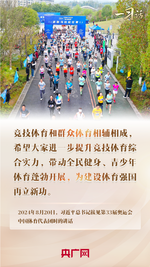 今天,參加各類體育活動正成為我們生活中許多人的一種生活方式。正如前不久奪得首屆奧運大眾馬拉松女子組冠軍的“90后”銀行程序員黃雪梅所說,作為一名業(yè)余選手,好成績的取得與生活區(qū)周邊越來越好的體育鍛煉環(huán)境密不可分。黨的二十屆三中全會提出,要完善全民健身公共服務(wù)體系,改革完善競技體育管理體制和運行機制。我們要貫徹落實習(xí)近平總書記接見中國體育代表團時的重要講話精神,在進一步提升競技體育綜合實力同時,帶動全民健身、青少年體育蓬勃發(fā)展,大力弘揚中國奧運會健兒在本屆奧運會上展現(xiàn)出的中華體育精神,共同推動體育強國和健康中國的發(fā)展。