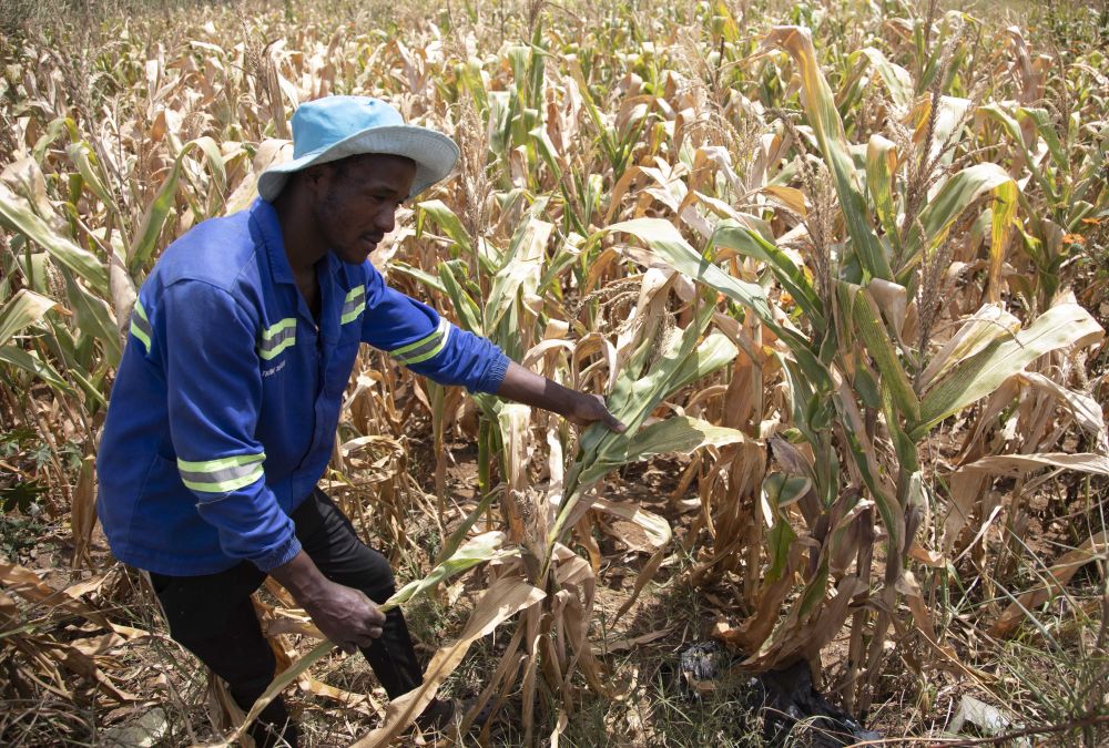 4月3日,農(nóng)民在津巴布韋首都哈拉雷近郊的一塊玉米地檢查作物長勢(shì)。新華社發(fā)