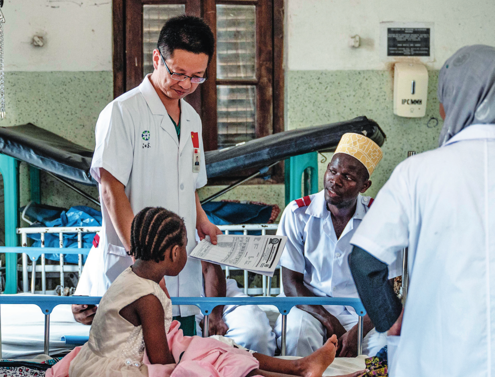 中國援桑給巴爾醫(yī)療隊(duì)隊(duì)長蔣國慶(左)在坦桑尼亞桑給巴爾的納茲莫加醫(yī)院查房(2023 年 12 月 29 日攝)王冠森攝 / 本刊
