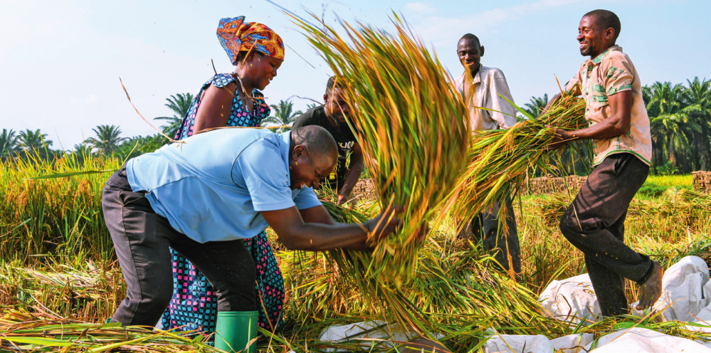 2018 年,中國農(nóng)業(yè)專家組在布隆迪布班扎省吉漢加縣設(shè)立首個水稻減貧示范村。圖為當(dāng)?shù)剞r(nóng)戶在稻田里給雜交水稻脫粒(2023年6月20日攝) 韓旭攝 / 本刊