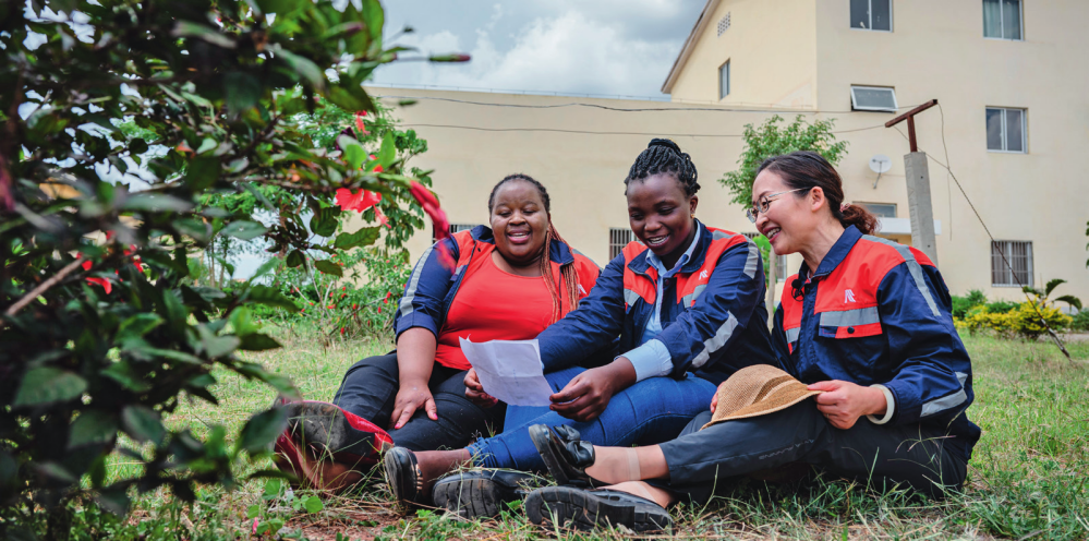 在肯尼亞內(nèi)羅畢,非洲之星鐵路運(yùn)營公司工電部電子設(shè)備檢修工區(qū)工長陳玲(右)在休息時教學(xué)員唱中文歌曲(2023年5月23日攝) 王冠森攝 / 本刊