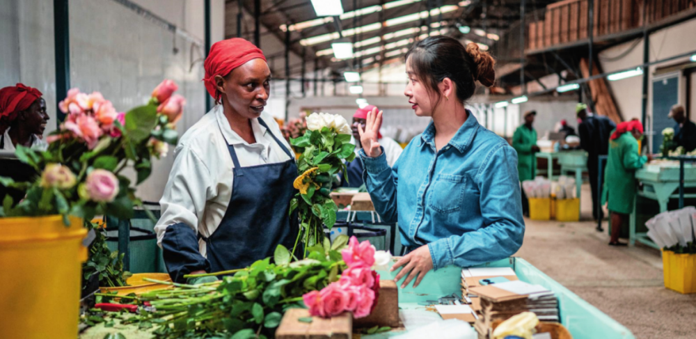 湖南璽悅國際貿(mào)易有限公司負(fù)責(zé)人黃梓楠(右)在肯尼亞納紐基的坦布濟(jì)花卉農(nóng)場挑選鮮花(2024年5月18日攝)王冠森攝 / 本刊
