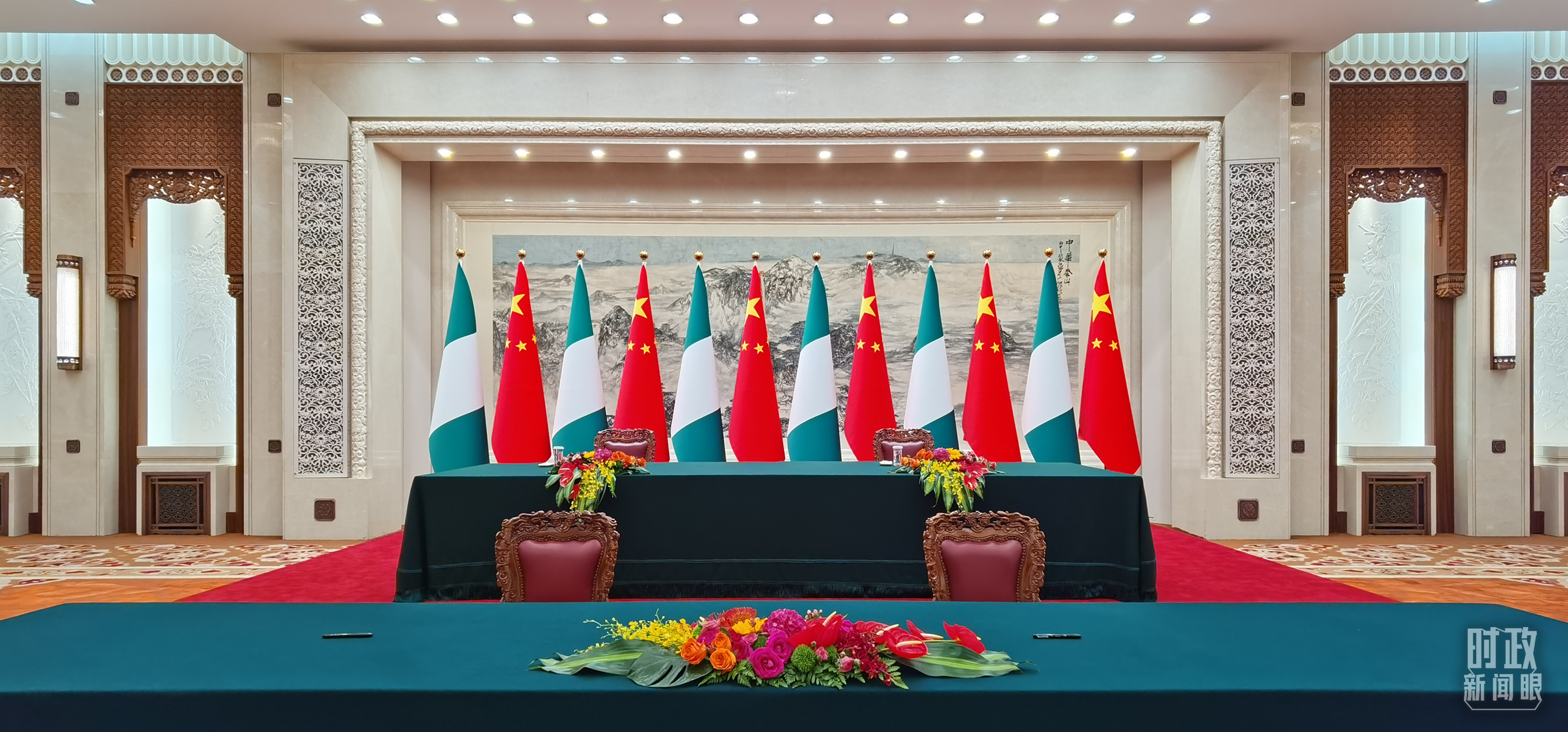 △中尼兩國(guó)元首在這里共同見證簽署多項(xiàng)雙邊合作文件,這是開始前的現(xiàn)場(chǎng)。(總臺(tái)央視記者郭鴻拍攝)