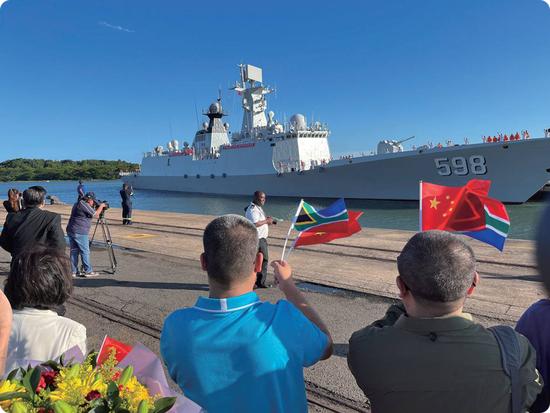 △聯(lián)合演習(xí)開始前一天,中國海軍日照艦抵達南非理查茲灣港口,受到歡迎