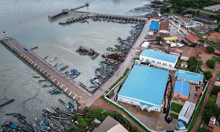 這是2024年7月8日在幾內(nèi)亞比紹首都比紹拍攝的板丁漁業(yè)碼頭和中企投建的水產(chǎn)品加工存儲(chǔ)綜合設(shè)施(右側(cè)藍(lán)頂建筑區(qū)域)(無(wú)人機(jī)照片)。新華社記者 韓旭 攝