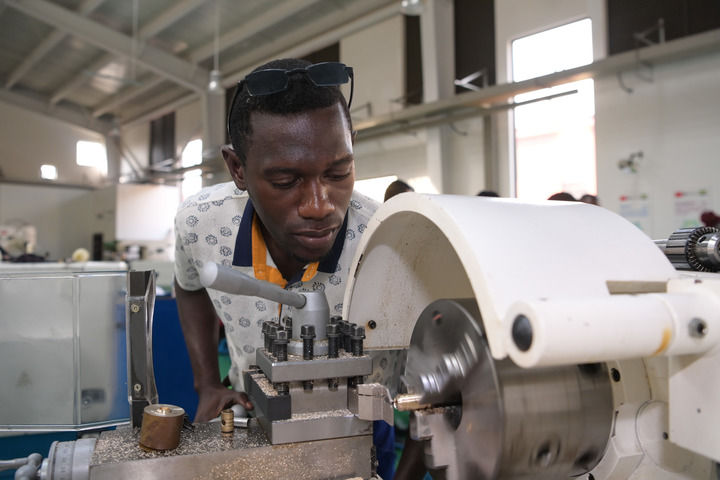 2023年1月10日,在加蓬首都利伯維爾的恩考克經(jīng)濟(jì)特區(qū),恩考克國(guó)際職業(yè)教育和培訓(xùn)中心(由中國(guó)航空技術(shù)國(guó)際控股有限公司聯(lián)合成都航空職業(yè)技術(shù)學(xué)院等院校共建)的學(xué)生進(jìn)行車(chē)削加工操作訓(xùn)練。新華社記者 韓旭 攝