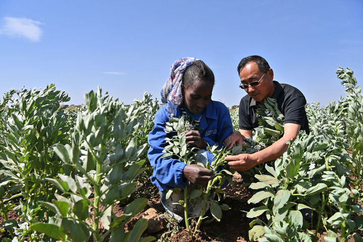 2023年9月27日,在位于厄立特里亞阿斯馬拉的農(nóng)業(yè)技術(shù)援助項(xiàng)目示范地,中國(guó)援厄第三期高級(jí)農(nóng)業(yè)專家組豆類(lèi)作物專家劉運(yùn)民(右)指導(dǎo)當(dāng)?shù)剞r(nóng)戶進(jìn)行蠶豆作物的田間管理。新華社記者 韓旭 攝