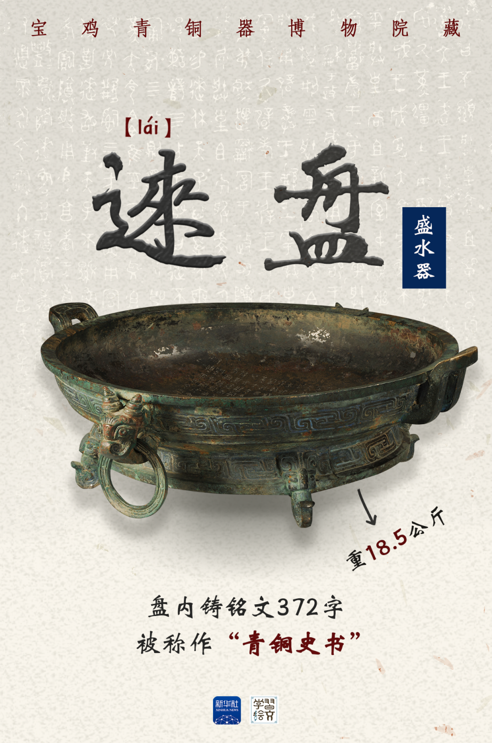 這件青銅器是被稱作“青銅史書”的逨盤。盤內(nèi)鑄銘文372字,完整記錄了單氏家族八代人輔佐西周12位周王征戰(zhàn)、理政、管治林澤的重要史事。從銘文中可看出,周人將家族命運(yùn)和國家命運(yùn)緊密結(jié)合,也是后來儒家“修身、齊家、治國、平天下”的思想基礎(chǔ)。