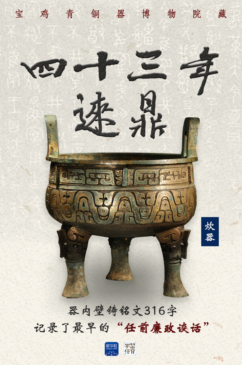 四十三年逨鼎共出土10件,大小不一。這是體積最大的一件,器內(nèi)壁鑄有銘文316字,講述了周宣王43年,逨被提拔為官司歷人,相當(dāng)于現(xiàn)在的監(jiān)察官。周天子告誡逨要施政謹(jǐn)慎、依法處罰、明辨是非、廉潔從政。這與《周禮》中的“六廉”——廉善、廉能、廉敬、廉法、廉正、廉辨相互呼應(yīng)。