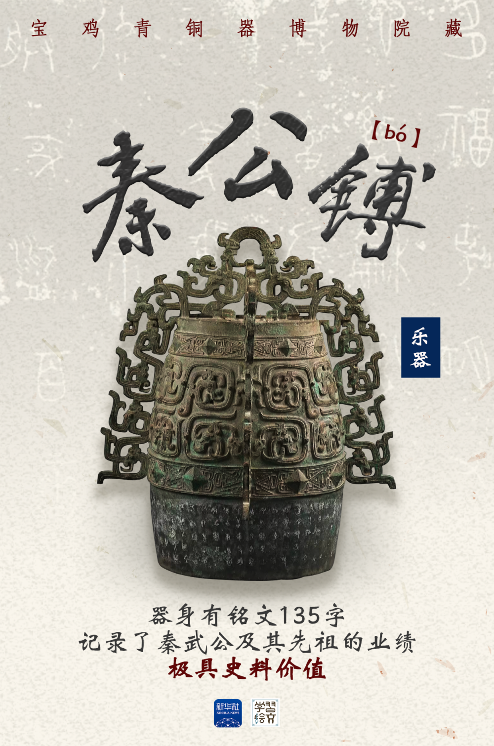 這件秦公镈是大型打擊樂器,器身有135字銘文,記述了秦襄公被周平王“賞宅受國”的歷史,以及文公、靜公、憲公三代治國興邦的業(yè)績,是研究秦國早期歷史的重要實(shí)物資料。