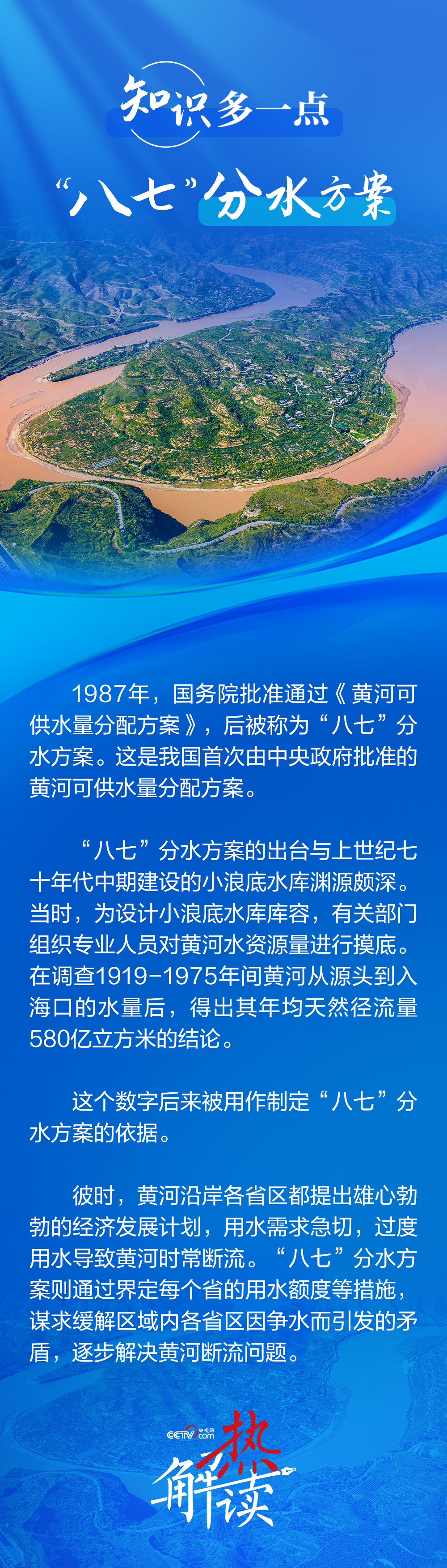 “八七”分水方案是上世紀(jì)八十年代我國(guó)批準(zhǔn)的黃河可供水量分配方案。該方案以1980年實(shí)際用水量為基準(zhǔn),綜合考慮了沿黃各省區(qū)的灌溉發(fā)展規(guī)模、工業(yè)和城市用水增長(zhǎng)以及大中型水利工程興建等因素,來(lái)為沿黃各省區(qū)分配黃河用水權(quán)?!鞍似摺狈炙桨缸?987年國(guó)務(wù)院批復(fù)后沿用至今,未重新調(diào)整。