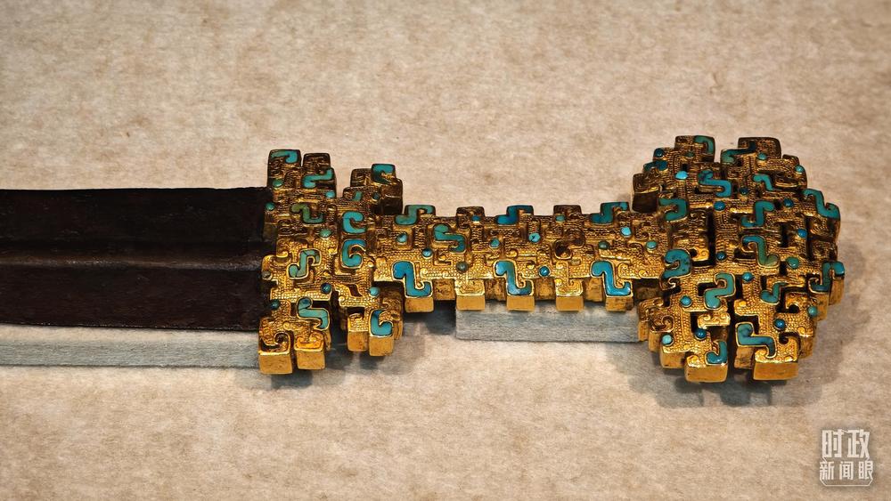 △這是1992年寶雞市益門二號(hào)墓出土的金柄鐵劍,劍柄嵌有綠松石。(總臺(tái)央視記者彭漢明拍攝)