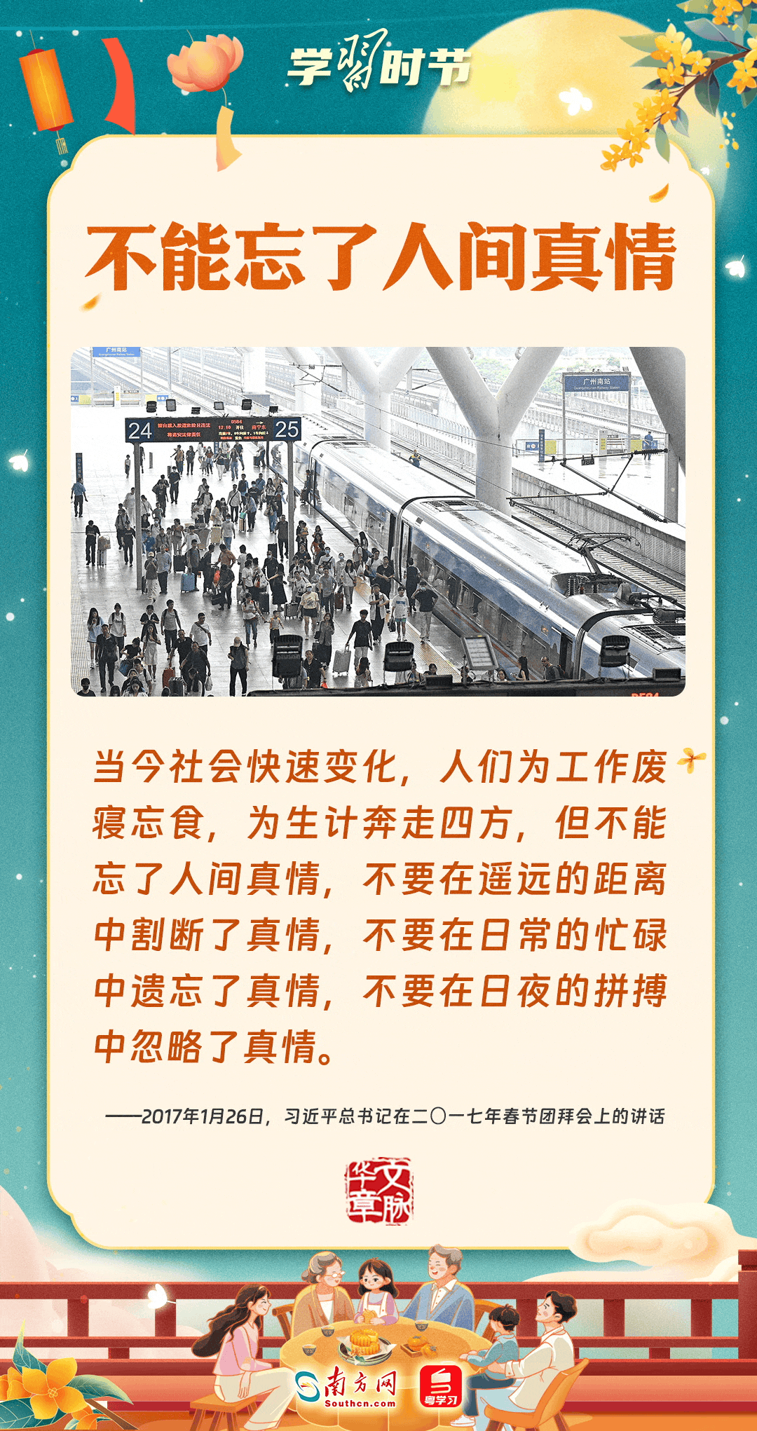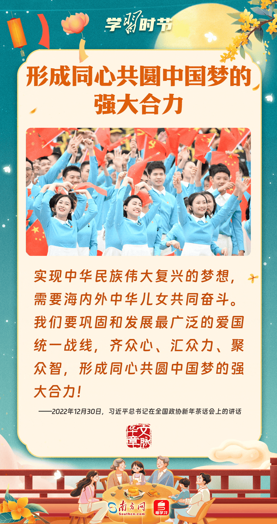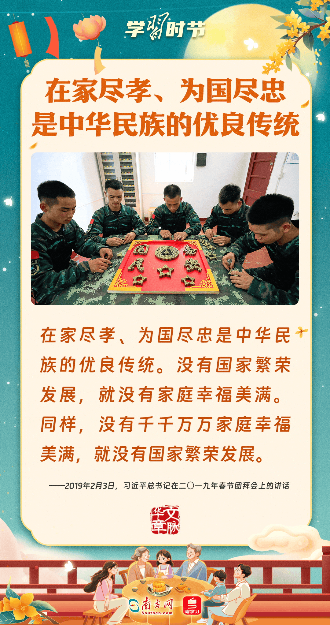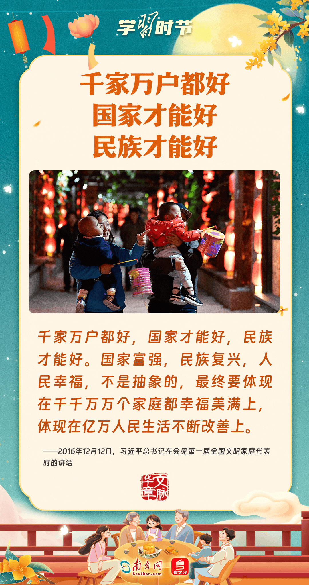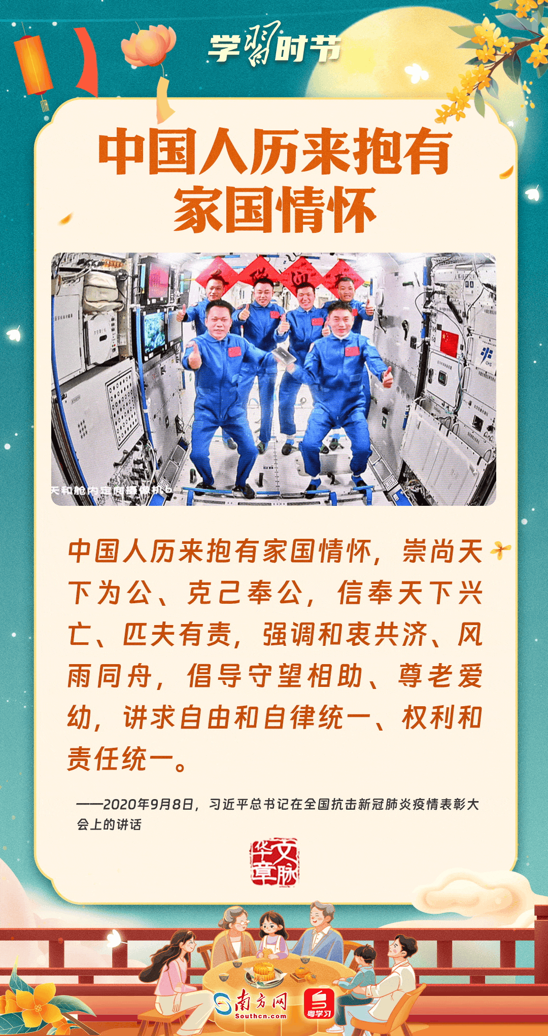 明月寄相思,家國總關(guān)情。作為中華優(yōu)秀傳統(tǒng)文化的重要載體之一,中秋節(jié)不但寄托著海內(nèi)外華人對闔家團(tuán)圓的美好期許,還承載著深厚的故鄉(xiāng)情、家國情。習(xí)近平總書記曾在多個場合深刻闡述個人、家庭與國家之間的關(guān)系,強(qiáng)調(diào)要厚植家國情懷,把實(shí)現(xiàn)個人夢、家庭夢融入國家夢、民族夢之中。中秋佳節(jié),讓我們一起回顧總書記那些經(jīng)典話語,共同感受他至深至厚的家國情懷。