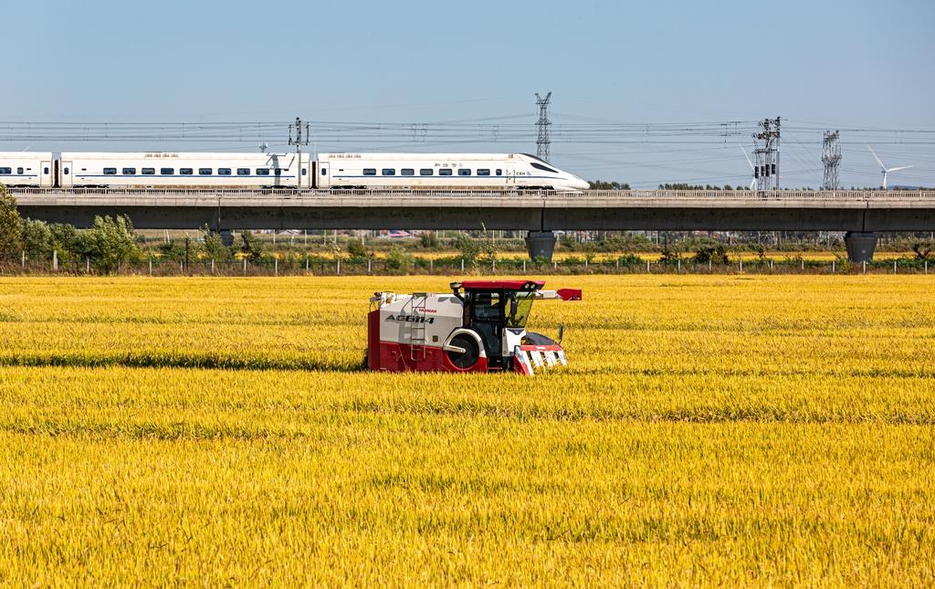 2024年9月18日,黑龍江省哈爾濱市阿城區(qū)料甸街道三家子屯,農民正在收割水稻。