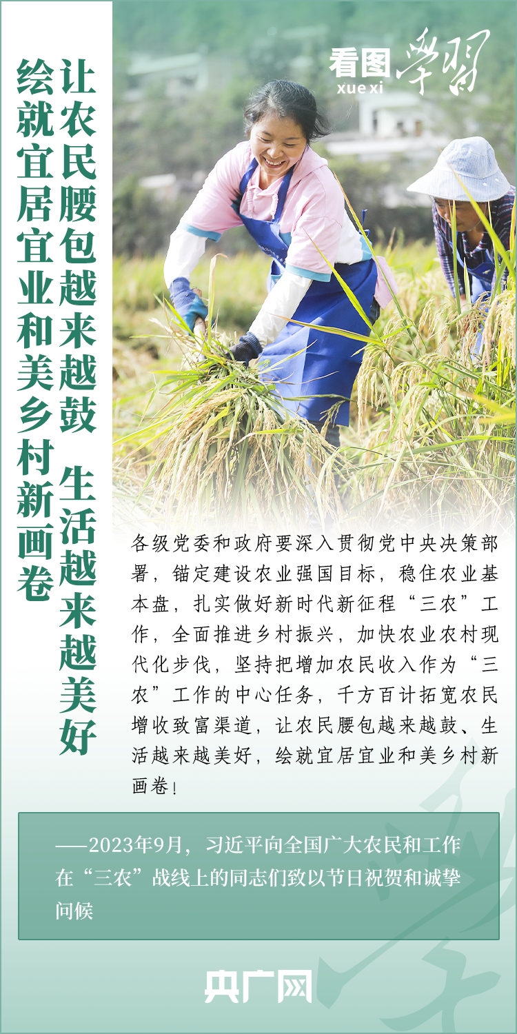 民族要復(fù)興,鄉(xiāng)村必振興。黨的十八大以來,每到各地考察調(diào)研,習(xí)近平總書記總會去農(nóng)村看一看,走進(jìn)田間地頭,和農(nóng)民拉拉家常??倳洀?qiáng)調(diào),“建設(shè)宜居宜業(yè)和美鄉(xiāng)村是農(nóng)業(yè)強(qiáng)國的應(yīng)有之義”,“要讓農(nóng)民腰包越來越鼓、生活越來越美好”。