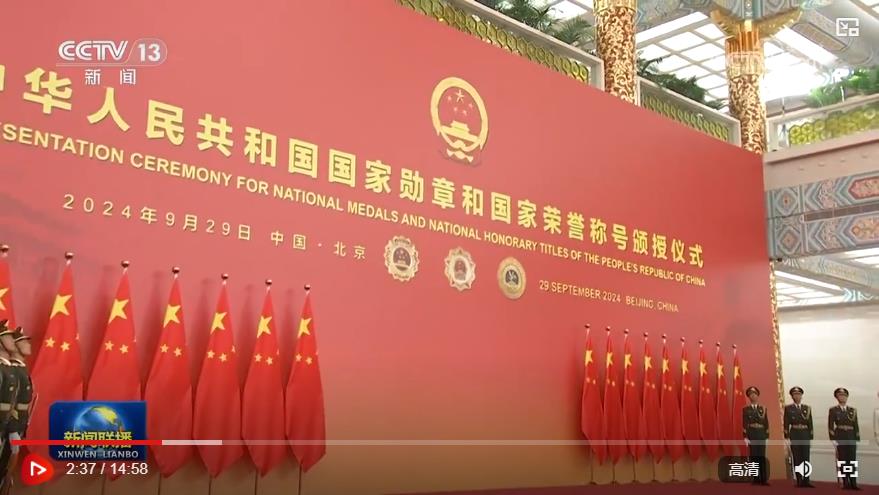 人民大會(huì)堂金色大廳,氣氛莊重?zé)崃?。巨幅紅色背景板上,共和國勛章、友誼勛章和國家榮譽(yù)稱號獎(jiǎng)?wù)聢D案熠熠生輝。背景板前,18面鮮艷的五星紅旗分列兩側(cè),18名英姿挺拔的禮兵持槍佇立。