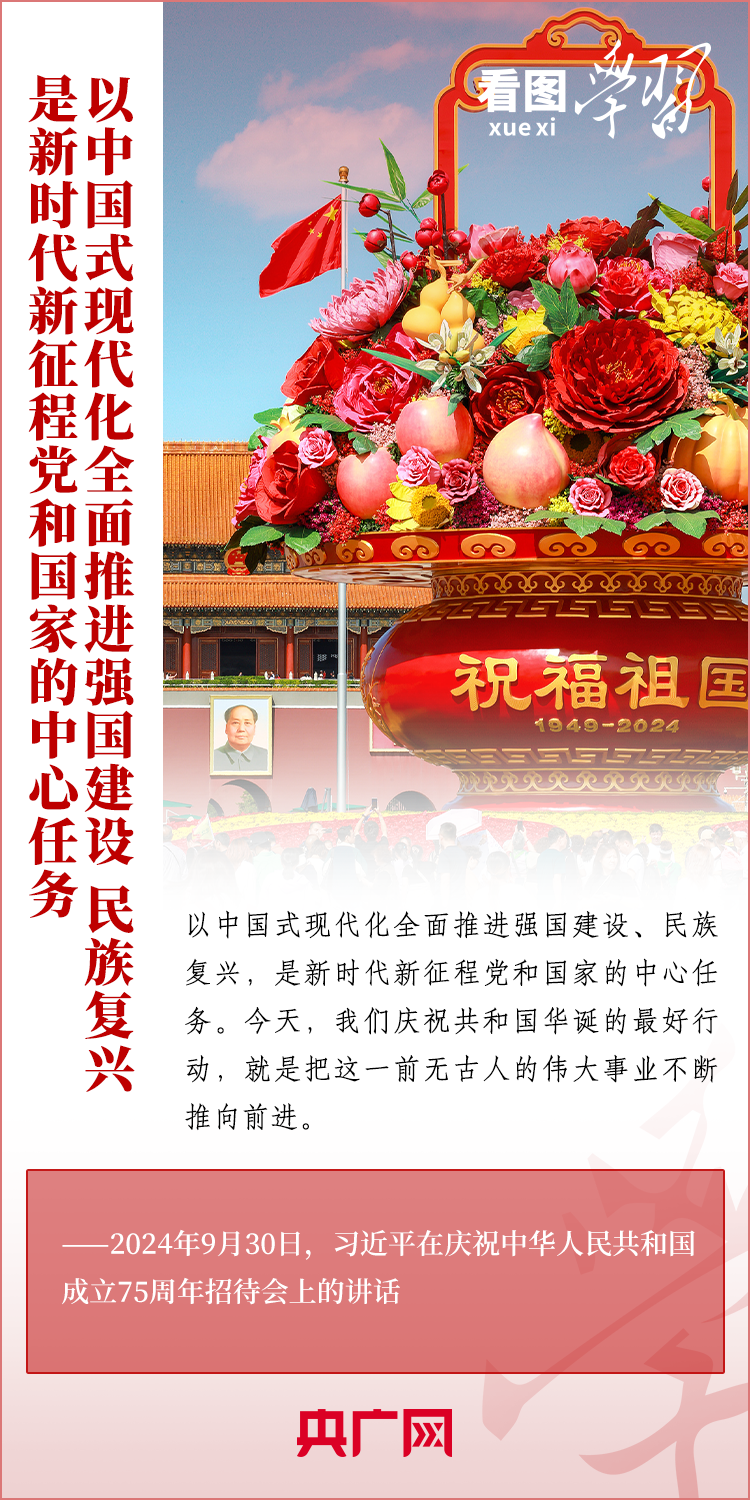 “經(jīng)過(guò)75年的艱苦奮斗,中國(guó)式現(xiàn)代化已經(jīng)展開(kāi)壯美畫(huà)卷并呈現(xiàn)出無(wú)比光明燦爛的前景?!?月30日,慶祝中華人民共和國(guó)成立75周年招待會(huì)在京舉行。習(xí)近平總書(shū)記出席招待會(huì)并發(fā)表重要講話??倳?shū)記強(qiáng)調(diào),以中國(guó)式現(xiàn)代化全面推進(jìn)強(qiáng)國(guó)建設(shè)、民族復(fù)興,是新時(shí)代新征程黨和國(guó)家的中心任務(wù)。我們慶祝共和國(guó)華誕的最好行動(dòng),就是把這一前無(wú)古人的偉大事業(yè)不斷推向前進(jìn)。