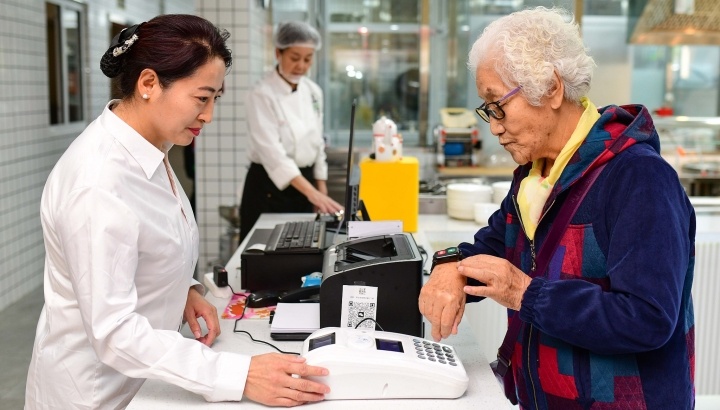 內(nèi)蒙古鄂爾多斯,一位老人在“鄰里食堂”掃碼用餐