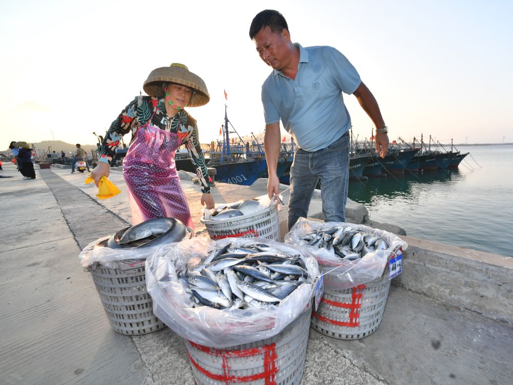 近日,澳角村村民在漁港碼頭上搬運海產品。新華社記者 姜克紅 攝
