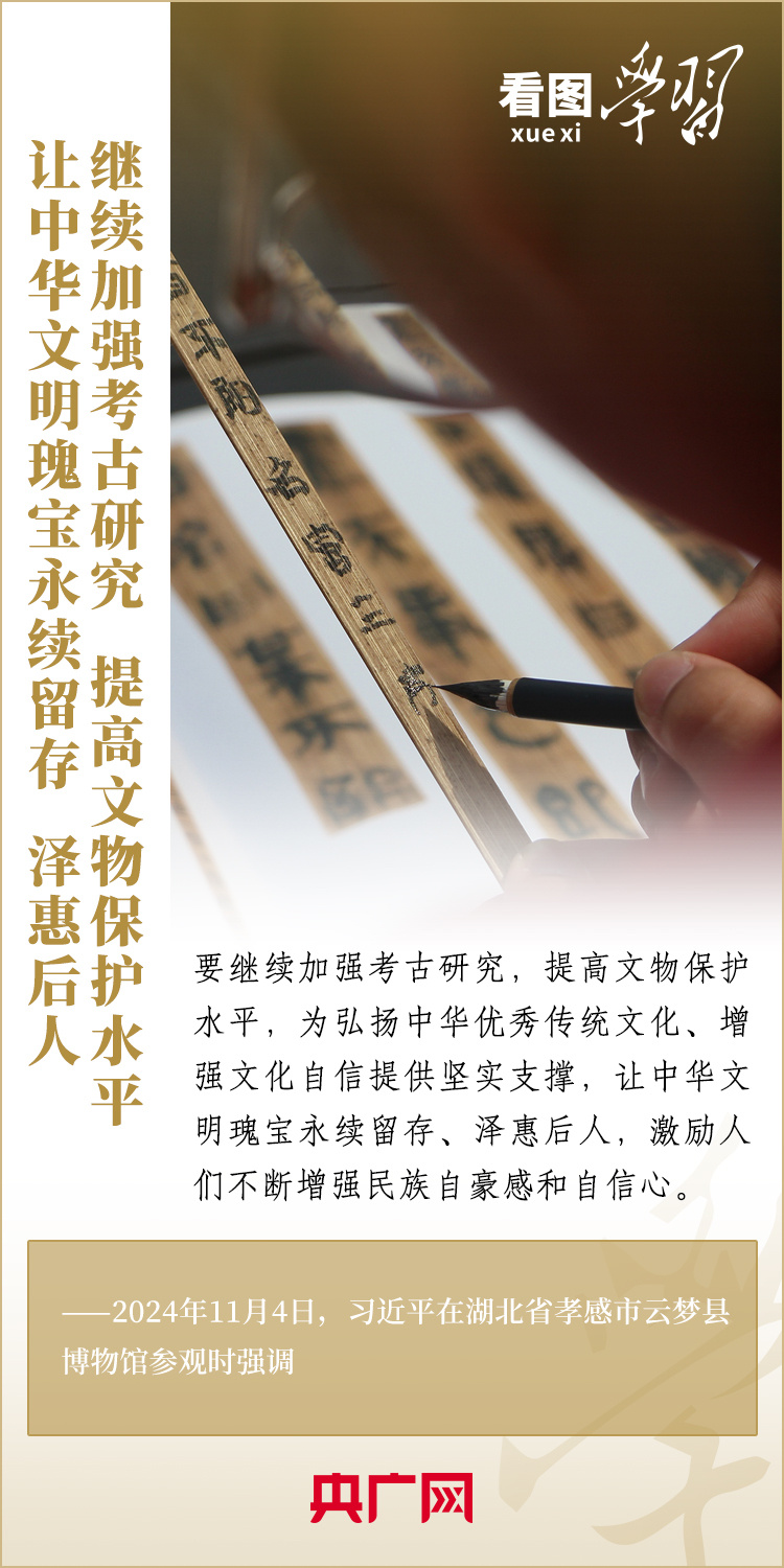 11月4日,習近平總書記在湖北省孝感市云夢縣博物館參觀出土秦漢簡牘展。這里收藏的我國考古史上首次發(fā)現(xiàn)的秦簡——云夢睡虎地秦簡,反映了戰(zhàn)國晚期到秦始皇時期的政治、經(jīng)濟、文化、法律、軍事等方面的情況。習總書記詳細聽取簡牘內容、歷史文化價值和保護研究情況介紹,指出要繼續(xù)加強考古研究,提高文物保護水平,讓中華文明瑰寶永續(xù)留存、澤惠后人。
