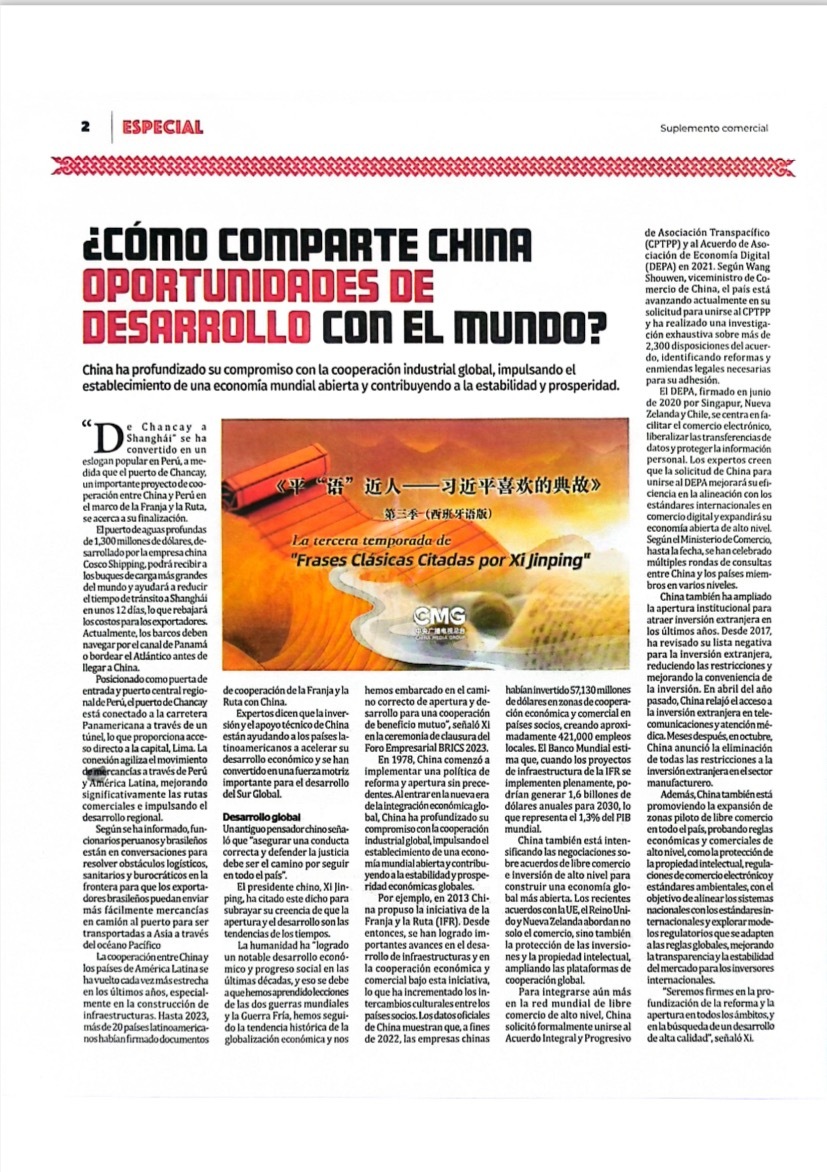 11月14日,秘魯最具影響力的官方報紙《秘魯人報》刊發(fā)節(jié)目在秘魯落播的消息。文章指出,《平“語”近人——習(xí)近平喜歡的典故》第三季展現(xiàn)了中華民族開放包容、兼收并蓄的文化胸懷,闡釋了習(xí)近平主席提出的推動構(gòu)建人類命運(yùn)共同體的這一重大理念,是對“建設(shè)一個什么樣的世界、怎樣建設(shè)這個世界”給出的中國方案?!睹佤斎藞蟆诽乜婵l(fā)《平“語”近人——習(xí)近平喜歡的典故》第三季(西班牙語版)將在秘魯主流媒體落播特稿?!睹佤斎藞蟆饭倬W(wǎng)也同步刊發(fā)了節(jié)目預(yù)告消息和海報。