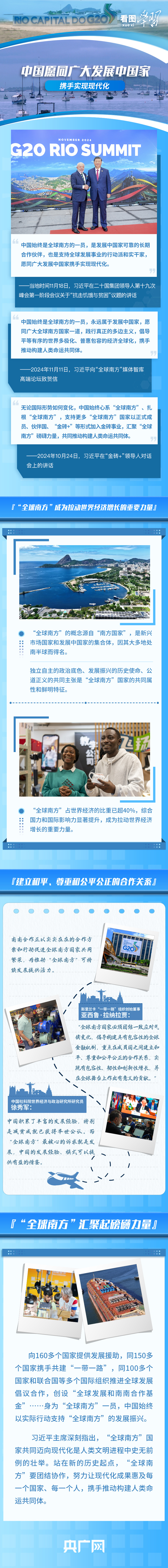 當?shù)貢r間11月18日,習(xí)近平主席在G20峰會第一階段會議就“抗擊饑餓與貧困”議題發(fā)表重要講話,呼吁作為世界主要大國領(lǐng)導(dǎo)人應(yīng)該秉持命運共同體意識,扛起歷史責任、展現(xiàn)歷史主動、推動歷史進步。習(xí)主席表示,中國始終是“全球南方”的一員,是發(fā)展中國家可靠的長期合作伙伴,并宣布中國支持全球發(fā)展的八項行動,愿同各方一道行動,建設(shè)一個共同發(fā)展的公正世界。
