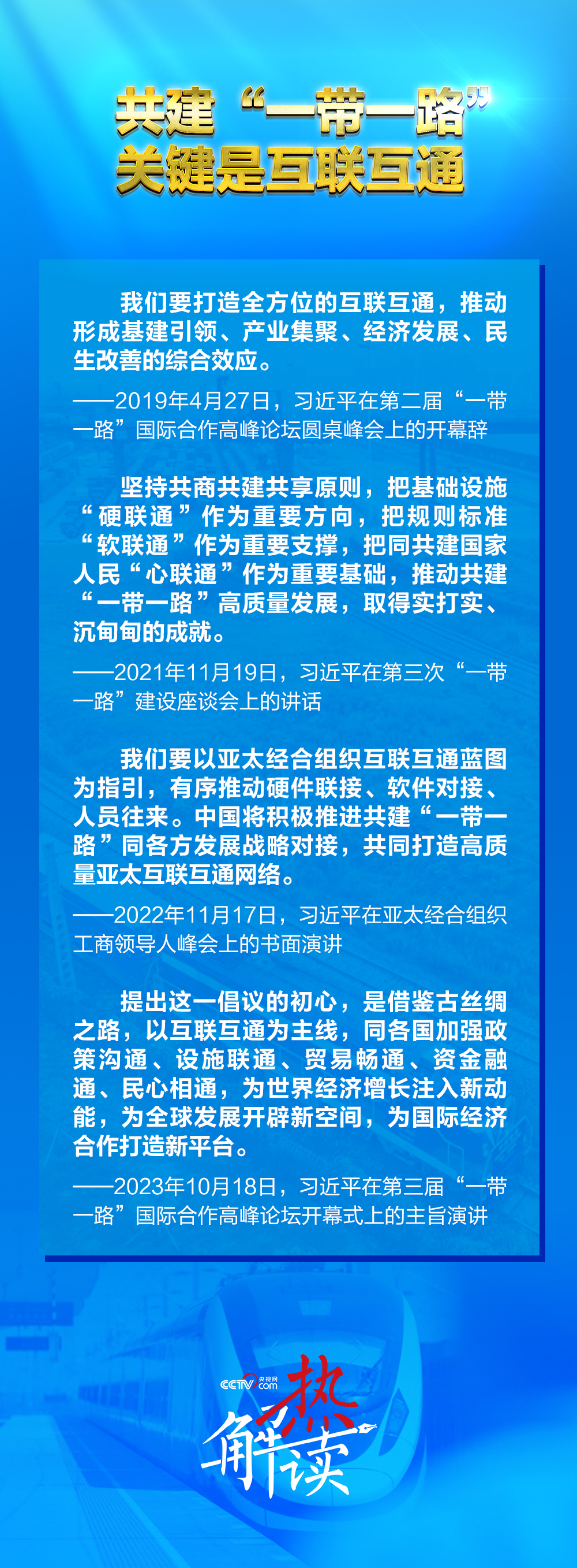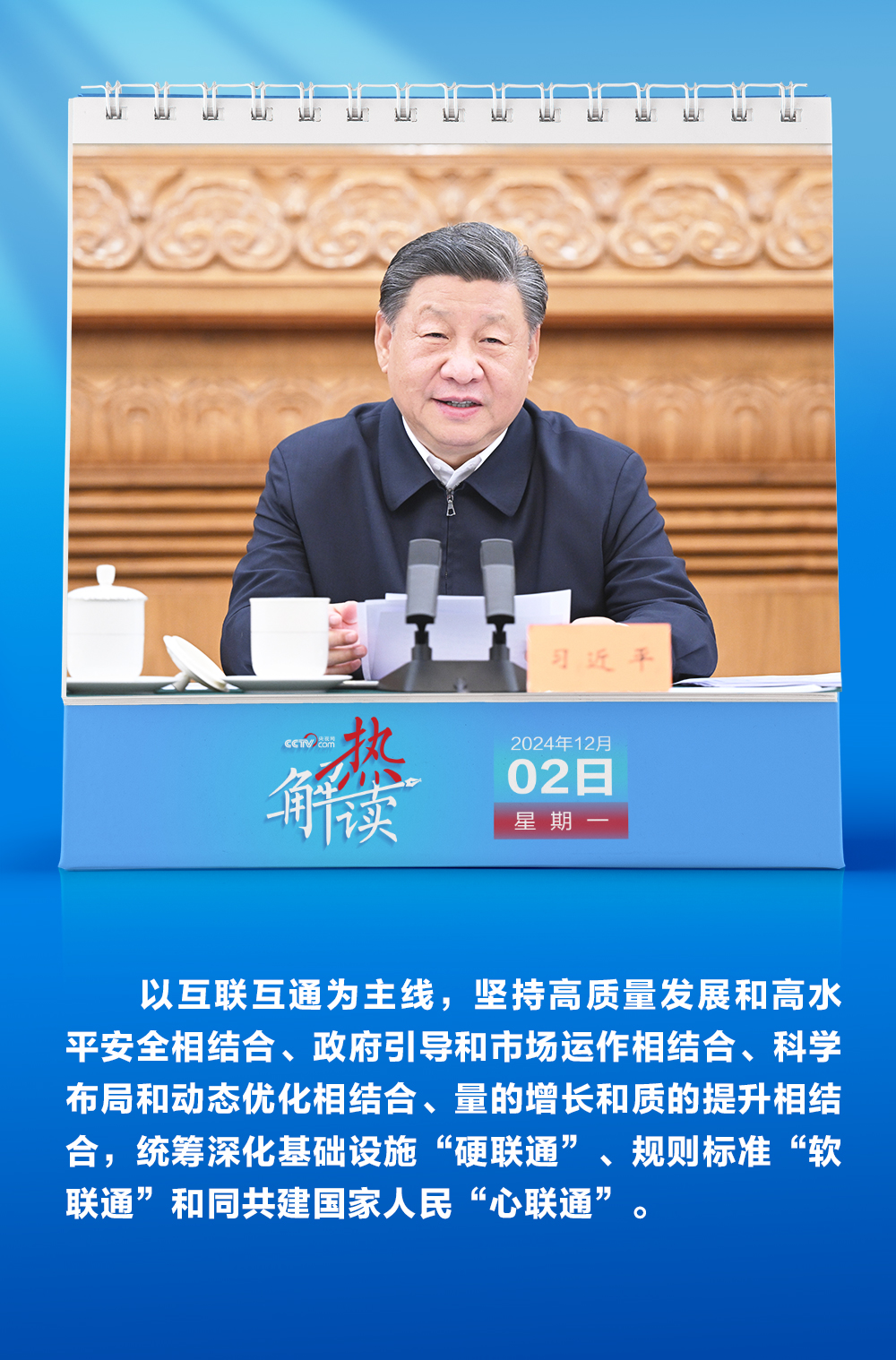 “統(tǒng)籌深化基礎(chǔ)設(shè)施‘硬聯(lián)通’、規(guī)則標準‘軟聯(lián)通’和同共建國家人民‘心聯(lián)通’”,“完善‘硬聯(lián)通’、‘軟聯(lián)通’、‘心聯(lián)通’協(xié)調(diào)推進機制”。12月2日,習(xí)近平總書記在第四次“一帶一路”建設(shè)工作座談會上對深化三個“聯(lián)通”再作部署。
