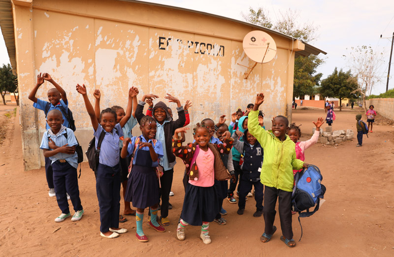 △ 當?shù)貢r間2023年7月25日,莫桑比克馬普托省皮科科村學(xué)校的孩子們站在裝有中國援助的衛(wèi)星電視接收天線的房屋前。