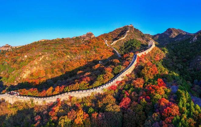 深秋的北京八達(dá)嶺長(zhǎng)城層林盡染,風(fēng)景如畫(huà)。