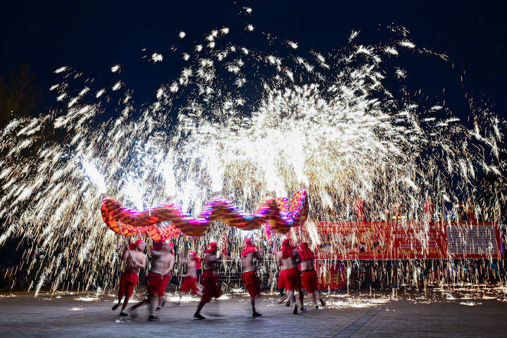 民間藝人在河南省洛陽(yáng)市2024隋唐河洛文化廟會(huì)上表演打鐵花(2024年2月14日攝)。新華社發(fā)(李衛(wèi)超攝)