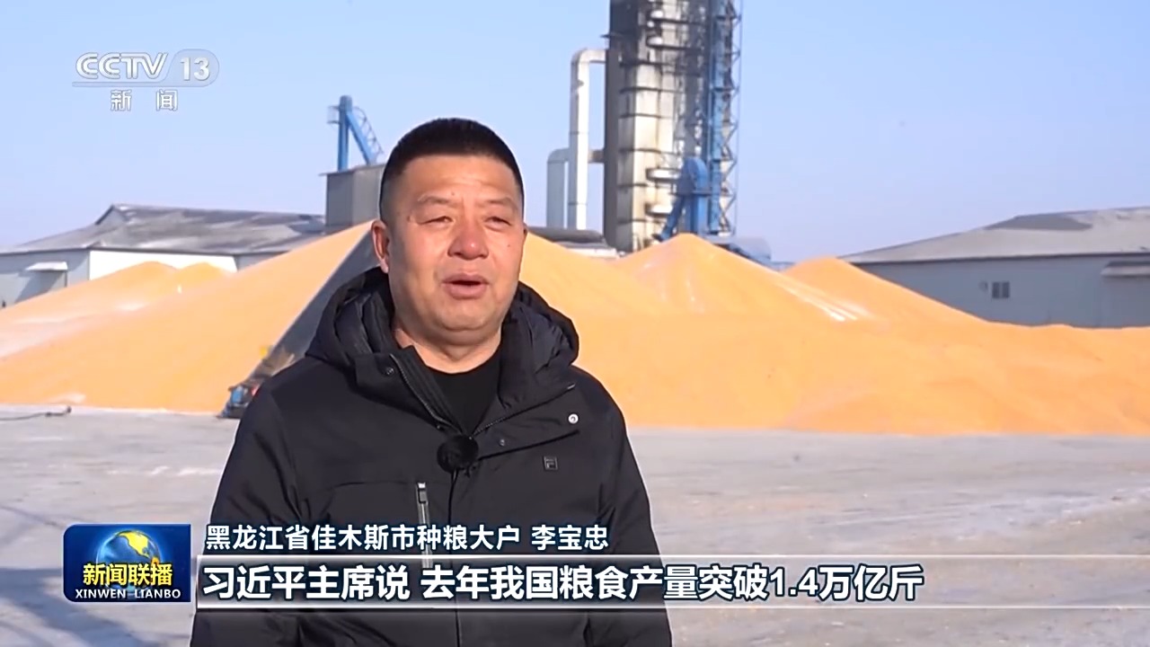黑龍江省佳木斯市種糧大戶 李寶忠:習(xí)近平主席說(shuō),去年我國(guó)糧食產(chǎn)量突破1.4萬(wàn)億斤,中國(guó)碗裝了更多中國(guó)糧。聽(tīng)到這話我心里特別自豪。今年春耕之前,我們要更新購(gòu)置大型高端智能的玉米收割機(jī),我要和鄉(xiāng)親們一起加油干,在農(nóng)業(yè)現(xiàn)代化的道路上扎實(shí)走好每一步,用我們的雙手把中國(guó)飯碗端得更牢。