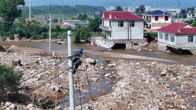 2024年8月22日,葫蘆島市電力部門工作人員在搶修因洪災中斷的線路。