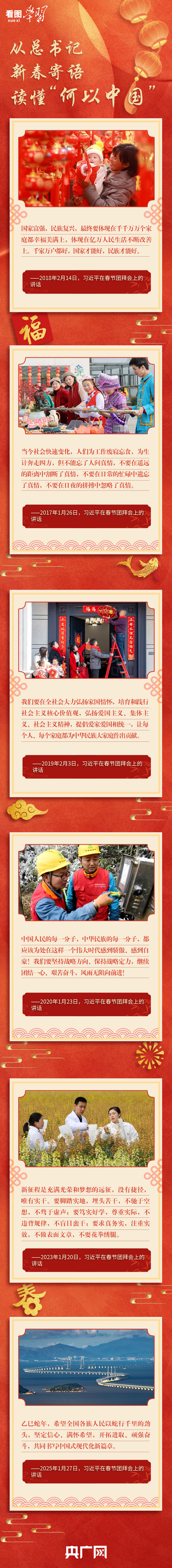 “千家萬(wàn)戶都好,國(guó)家才能好,民族才能好?!薄靶抡鞒淌浅錆M光榮和夢(mèng)想的遠(yuǎn)征,沒(méi)有捷徑,唯有實(shí)干”……每年春節(jié)團(tuán)拜會(huì)上,習(xí)近平總書記對(duì)同胞們飽含深情的新春祝福,鼓舞人心、凝聚力量。讓我們重溫這些暖心寄語(yǔ),在新的一年里,堅(jiān)定信心、滿懷希望,以蛇行千里的勁頭,為實(shí)現(xiàn)更加美好的未來(lái)不懈奮斗!