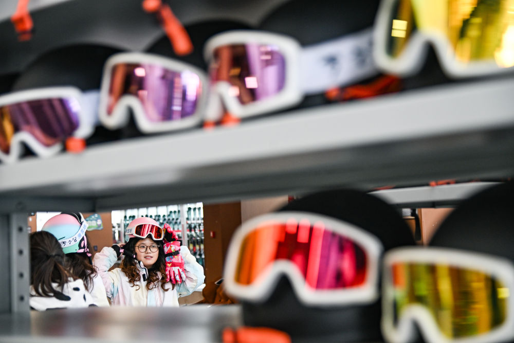 2025年1月23日,游客在湖北神農(nóng)架林區(qū)木魚鎮(zhèn)街邊一家店鋪挑選雪具雪服。自然天成的地理環(huán)境造就豐富的冰雪資源,也給當(dāng)?shù)剡\(yùn)動裝備銷售、租賃行業(yè)帶來了商機(jī)。