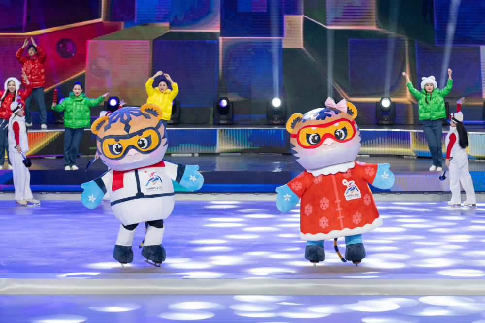 2024年4月13日,2025年第九屆亞洲冬季運(yùn)動(dòng)會(huì)倒計(jì)時(shí)300天主題活動(dòng)在哈爾濱舉行,吉祥物“濱濱”(前左)、“妮妮”(前右)在活動(dòng)現(xiàn)場(chǎng)表演。新華社記者 謝劍飛 攝