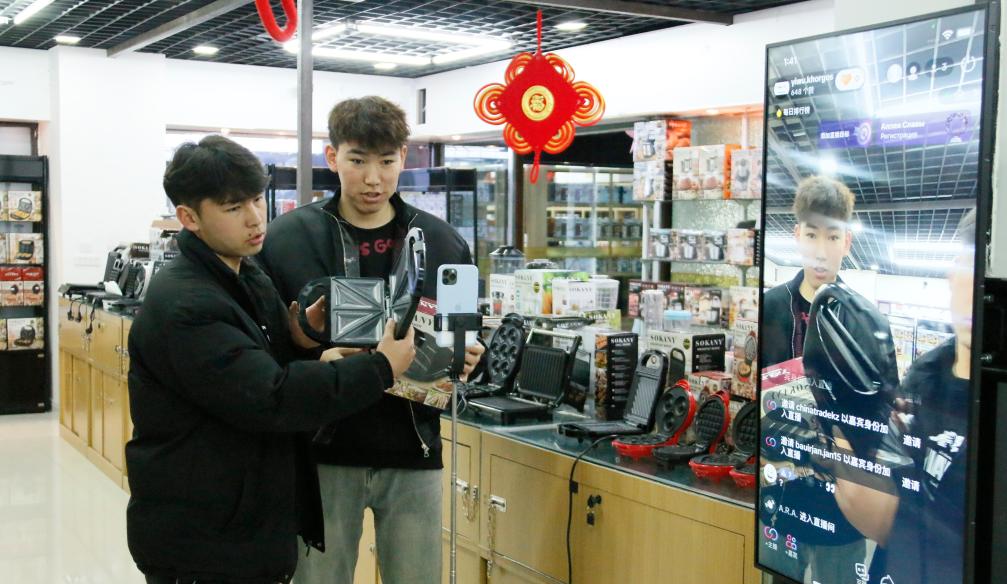 2月18日,在中哈霍爾果斯國際邊境合作中心的義烏國際商貿(mào)城里,跨境電商主播向中亞消費者介紹中國商品。(馬婷婷 攝)