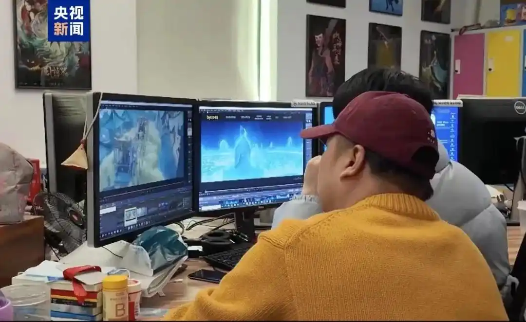 《哪吒2》壯觀的特效背后,是全國138家動畫公司的合力托舉。圖為創(chuàng)作團隊正在確認(rèn)畫面效果。